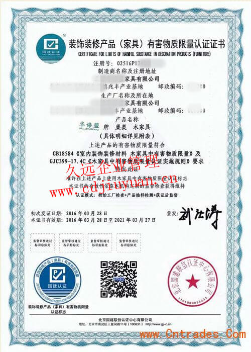 家具有害物質(zhì)限量認證證書
