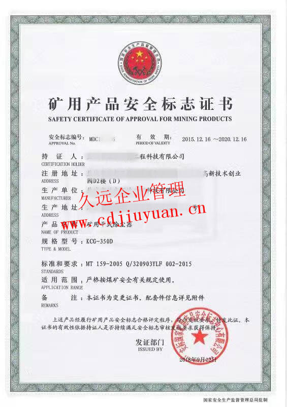 礦用產(chǎn)品安全標志認證證書